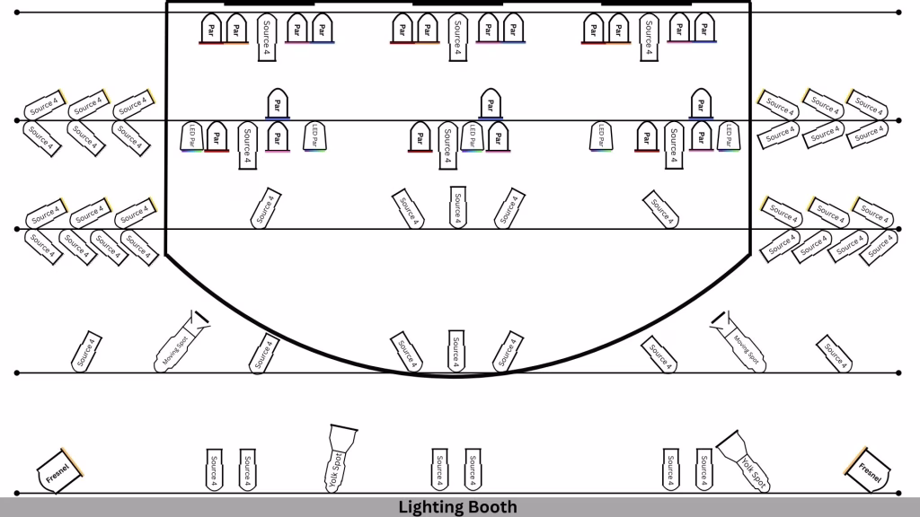 Hard-wired clear-com system with two connections backstage, two connections in light booth, and one connection at sound board.