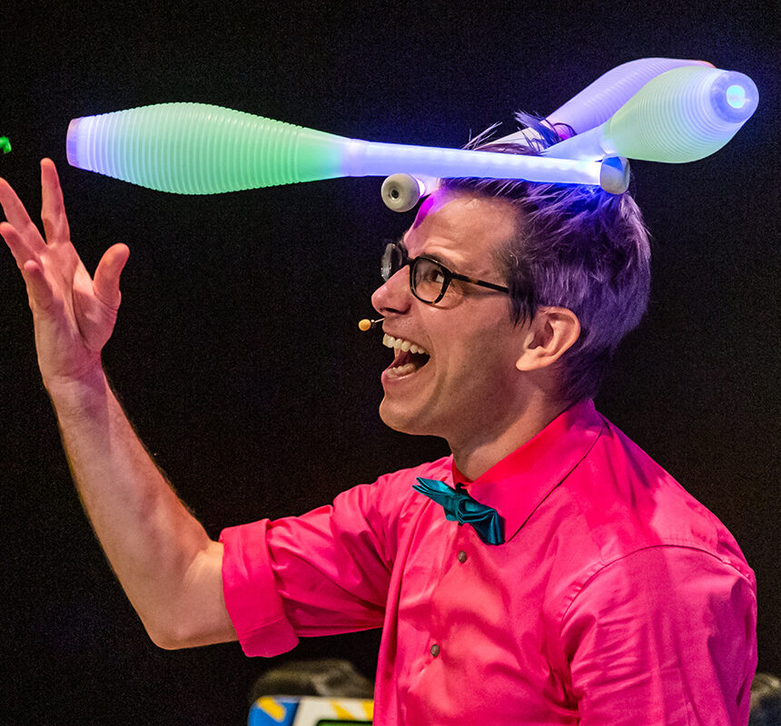 The “Professional Zaniac,” whoʼs been cracking jokes onstage for almost 15 years, zigzags between physical stunts and non-stop comedy. During the show vegetables are sliced in half by flying playing cards, flaming torches and bowling balls are juggled with ease, and every audience volunteer leaves the stage in triumph.